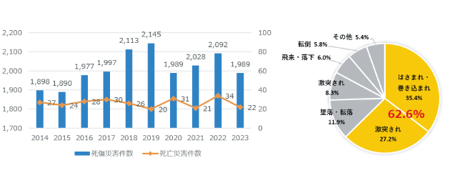 「はさまれ・巻き込まれ」や「激突され」など、人との接触事故が62.6%を占めています(厚生労働省労働災害統計より)